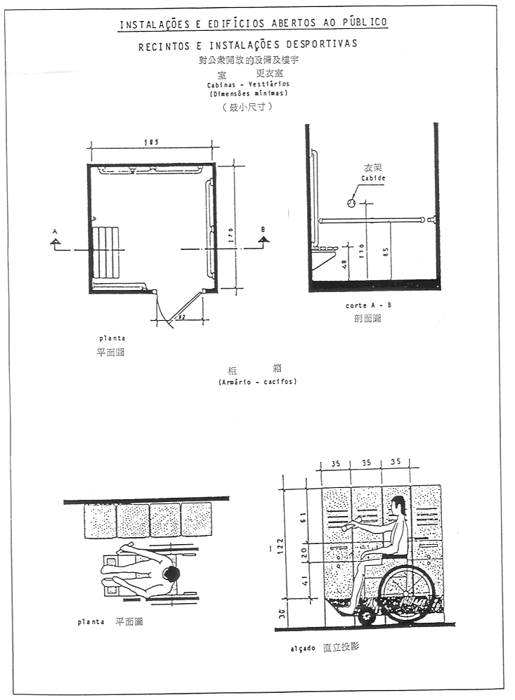 | V | R | 衣櫃: 置於地面,無脚及使輪椅之座進入內面者: 高度── 一七○公分; 深度── 六○公; 在一四○公分處為掛衣架粗棍; 衣架固定在一二○公分處; 裝置在離地面四○與一三○公分之間、深度為三○至四○公分之可能有的櫃隔 裝置在離地面四○乘一一○公分,深度為三○至四○公分及抽屜; |