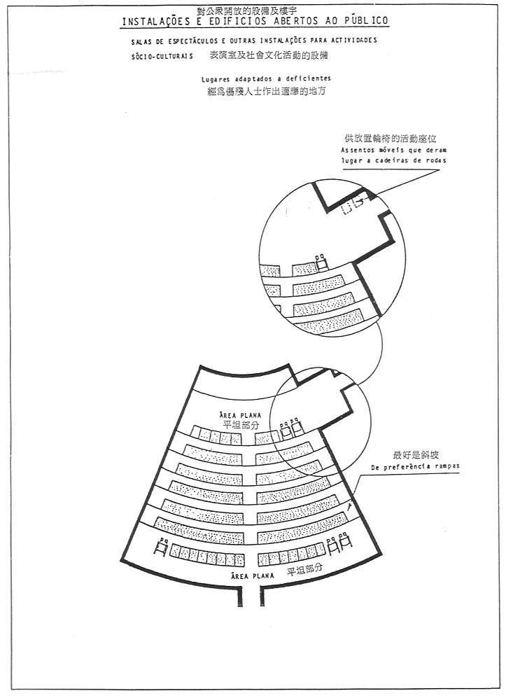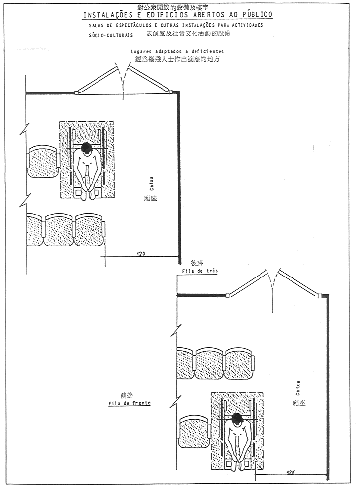 | 在觀眾之間而為傷殘人士保留的坐位特徵平面面積:一○○公分乘一五○公分通道(走廊)最小濶度為九○公分; 較遊戲場所的水平線為高; 位於更容易到達的地方。 |