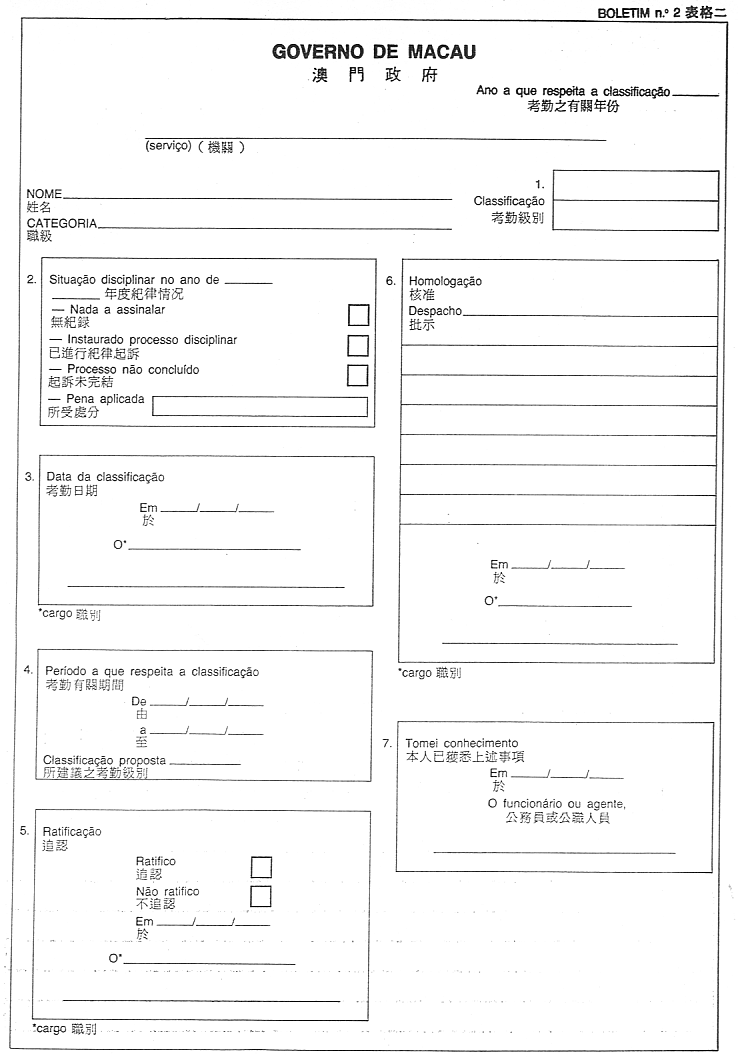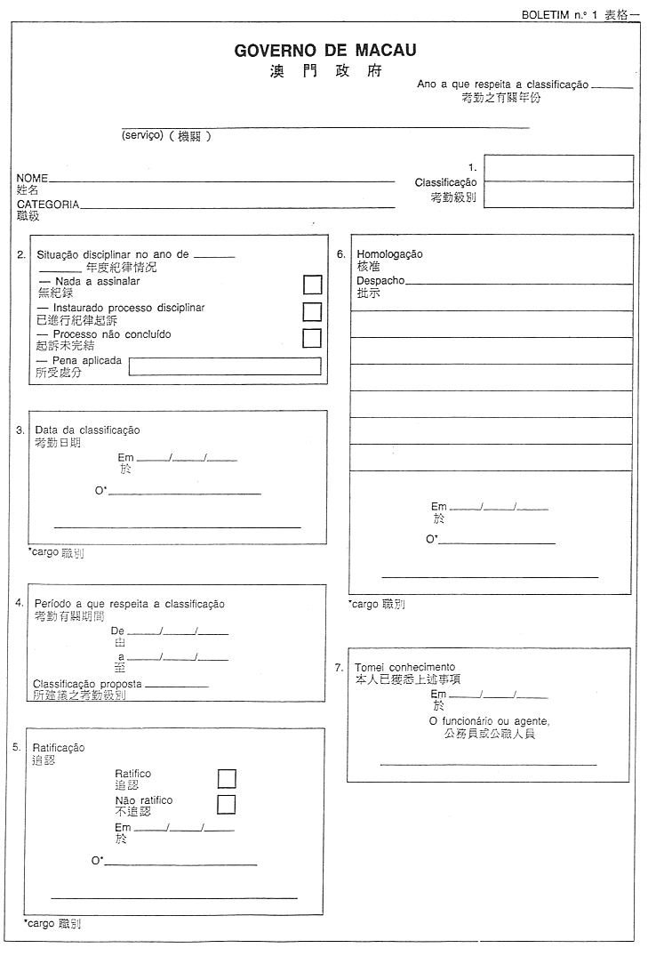 1. Serão utilizados os Boletins de Notação em anexo, que constituirão modelo exclusivo da Imprensa Oficial de Macau, destinando-se:*