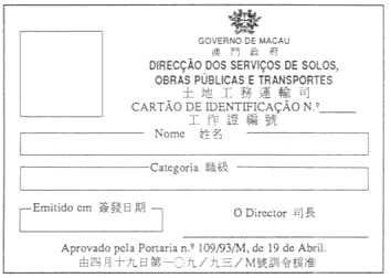 (四月十九日第一○九/九三/M號訓令第一條所指之工作證弍様)