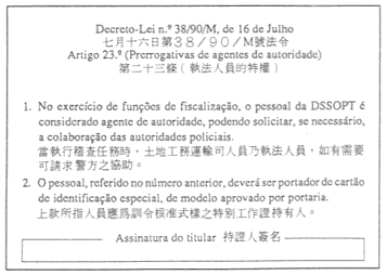 第二條——該證必須由土地工務運輸司司長或其法定代任人簽名及經同時印在該簽名處和持證人相片任一下角之該司鋼印認證,方為有效。