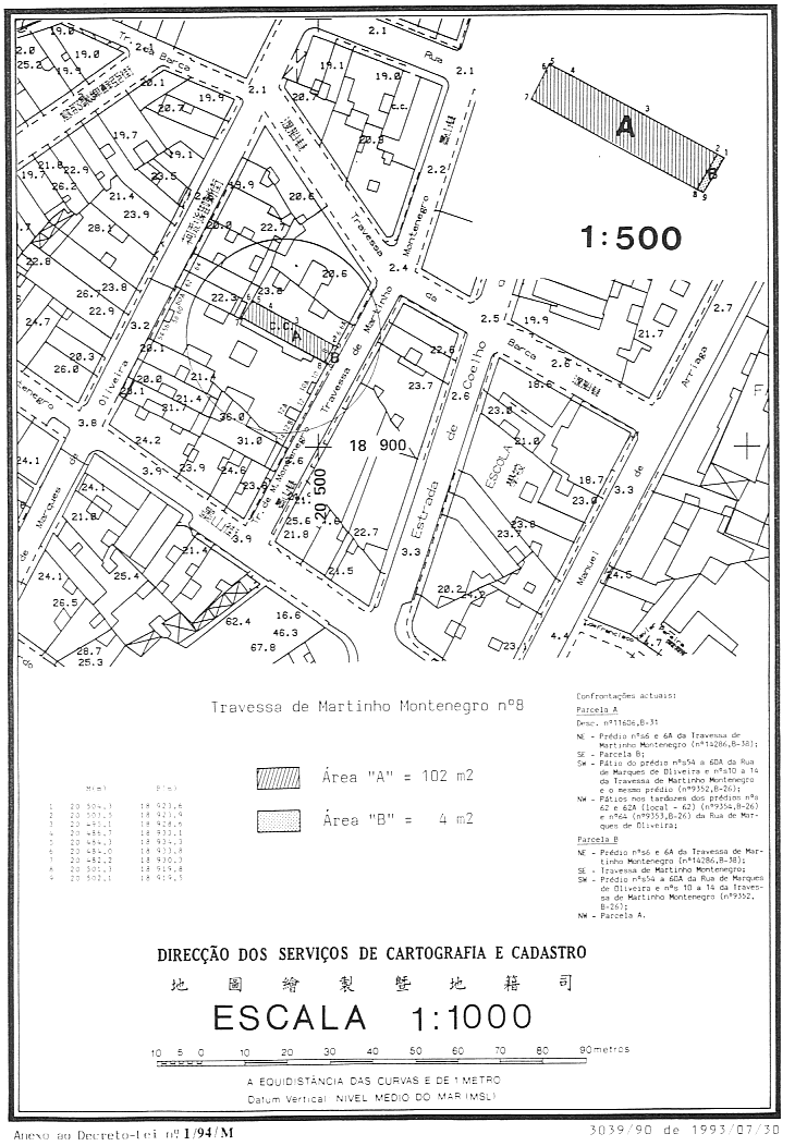 O adequado aproveitamento urbanístico definido para a Travessa de Martinho Montenegro, n.º 8, aconselha a anexação da parcela com a área de 4 (quatro) metros quadrados ao terreno assinalado com a letra "A" na planta n.º 3 039/90, emitida em 30 de Julho de 1993, pela Direcção dos Serviços de Cartografia e Cadastro, de forma a permitir o acerto da fachada dos edifícios daquela rua.