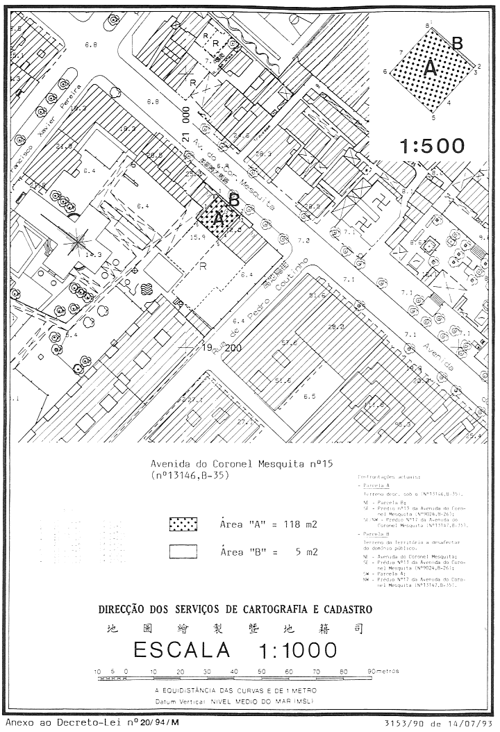 在都市規劃方面,為適當再利用澳門美副將大馬路十五號樓宇所在之地段,必須將拆毀該樓宇所騰出之地段,與另一幅在地圖繪製暨地籍司於一九九三年七月十四日發出之第3153/90號地籍圖內以字母“B”標明而面積為五平方米之相鄰地段併合,以配合此馬路建築物之正面排列。
