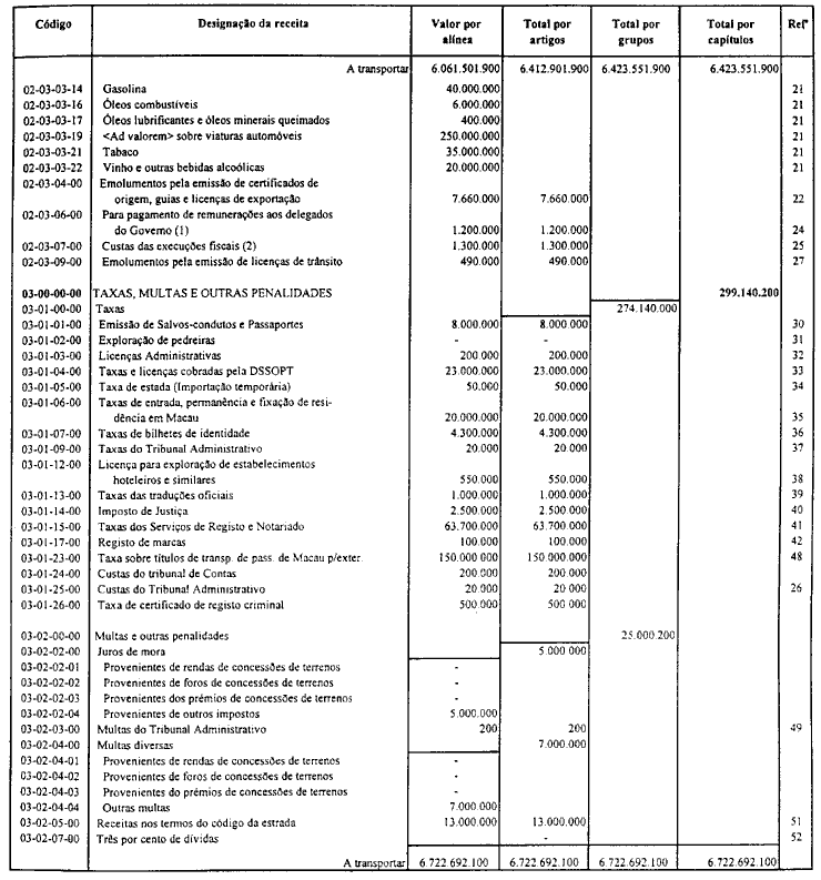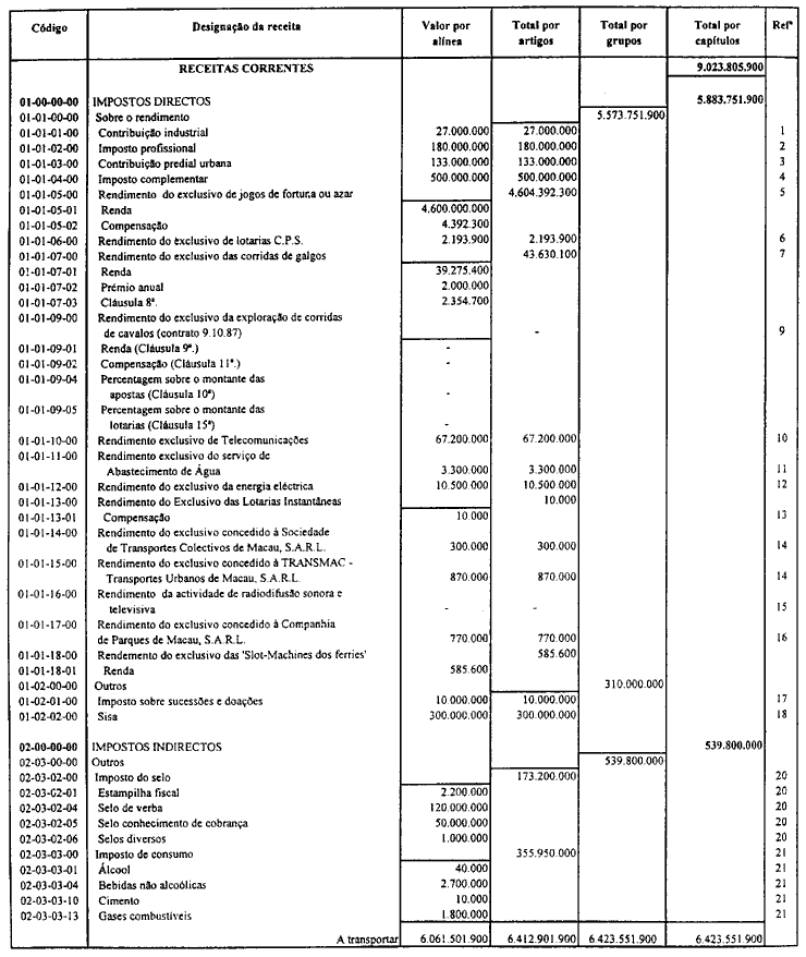 O produto global das contribuições, impostos directos se indirectos e restantes receitas é avaliado em 9 193 205 900,00 patacas e será cobrado, durante o ano de 1995, em conformidade com as disposições legais que regulam ou venham a regular a respectiva arrecadação, devendo ser aplicado no pagamento das despesas a efectuar no mesmo ano, nos termos da legislação em vigor.
