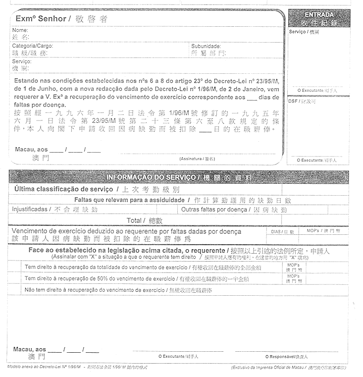 第二條 —— 一、有意收回因病缺勤期間被扣除的薪金的公職工作人員,應於七月份或下一年一月間,又或於公職工作人員在行政當局永久終止職務時,以本法規附件中的格式,呈交其申請。