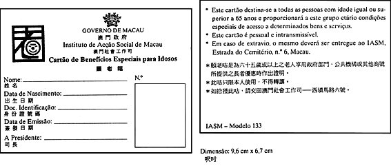 三、頤老咭按照賦予本批並成為本批示一部份的式樣由澳門社會工作司免費發放。
