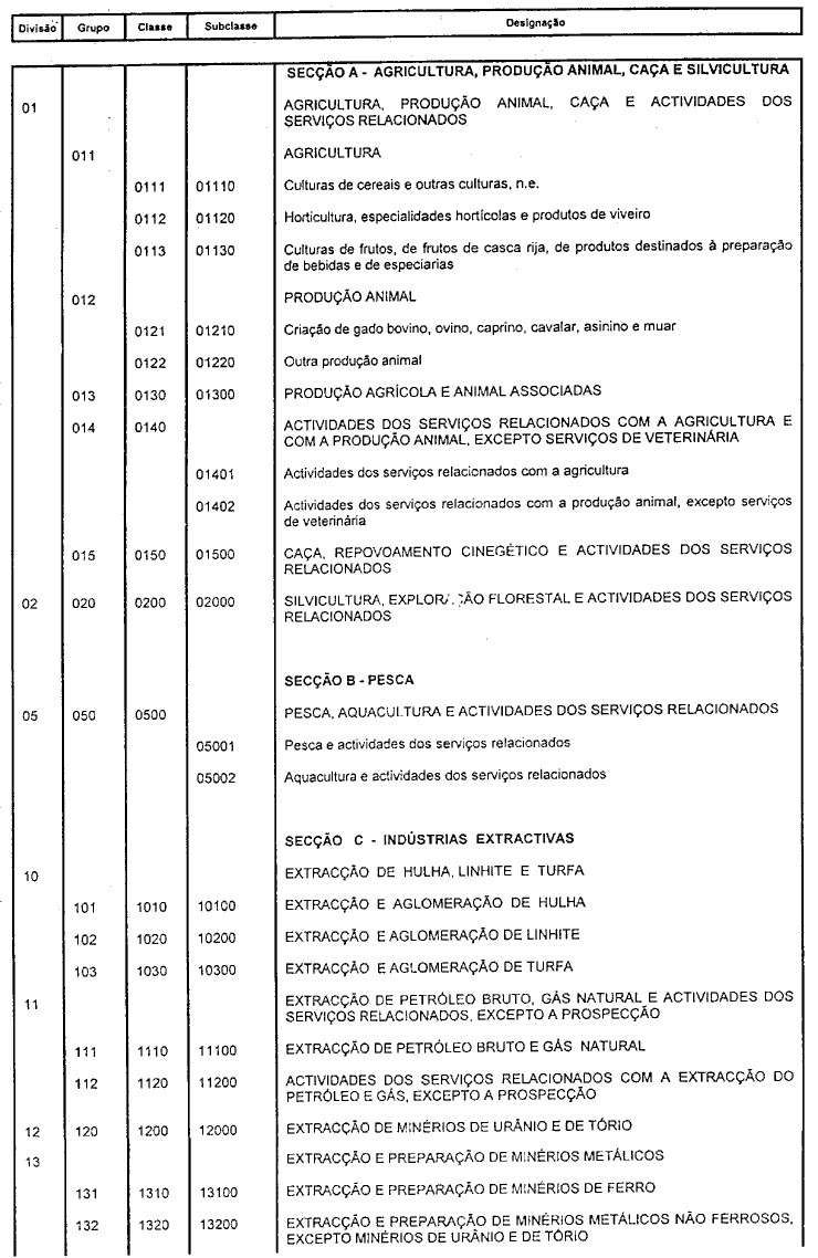 01 AGRICULTURA, PRODUÇÃO ANIMAL, CAÇA E ACTIVIDADES DOS SERVIÇOS RELACIONADOS A