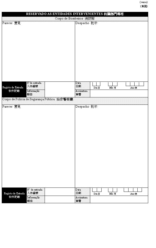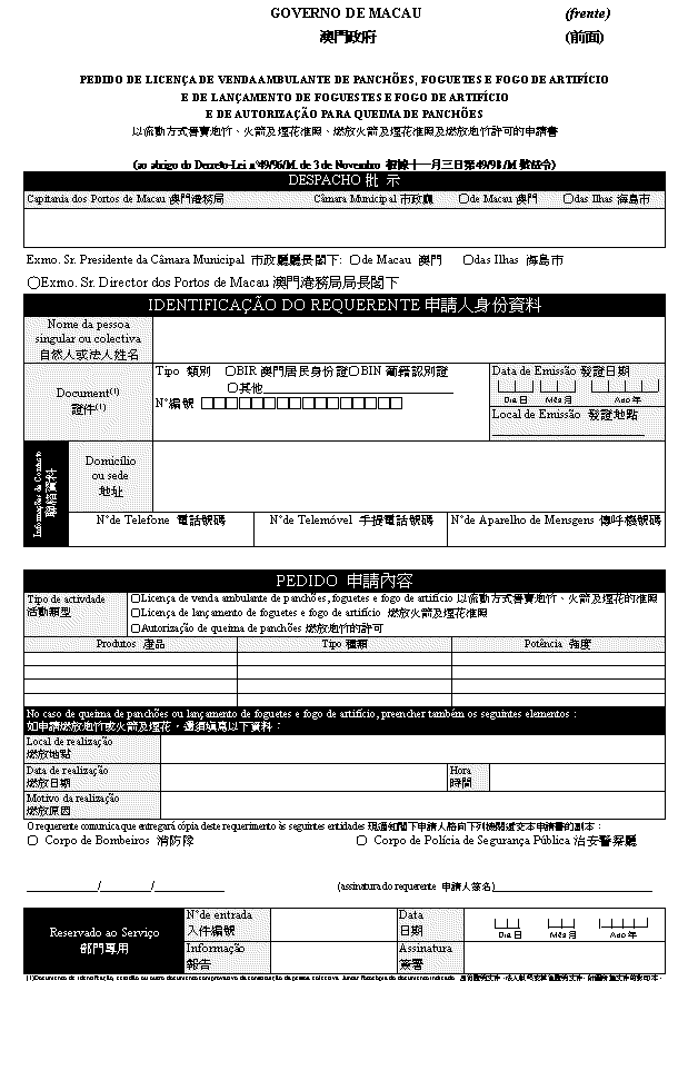 按設立售賣、燃放爆竹、火箭及煙花制度的十一月三日第49/98/M號法令規定,有需要公布有關這些活動的許可及准照的申請表格式樣。
