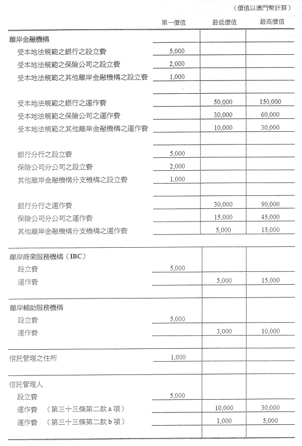 獲准於澳門從事離岸活動之機構須繳付之設立費及運作費定為本批示附表所載者。