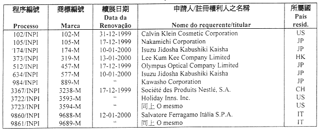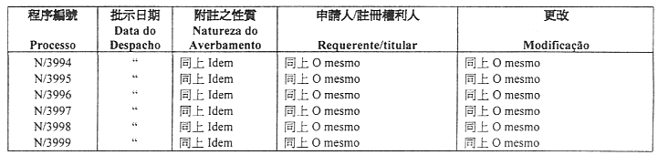 根據十一月六日第56/95/M號法令第十六條及第三十三條,以下公布本地區商標註冊之請求書,並按照相同法規第三十條及第三十四條,由通告公布日期開始計算三十日期限內,得提出產品及服務分類之聲明異議,及任何人認為倘給予註冊將對其造成損害得由通告公布日期開始計算九十日期限內提出聲明異議。
