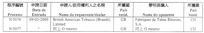 根據十一月六日第56/95/M號法令第十六條及第三十三條,以下公布本地區商標註冊之請求書,並按照相同法規第三十條及第三十四條,由通告公布日期開始計算三十日期限內,得提出產品及服務分類之聲明異議,及任何人認為倘給予註冊將對其造成損害得由通告公布日期開始計算九十日期限內提出聲明異議。