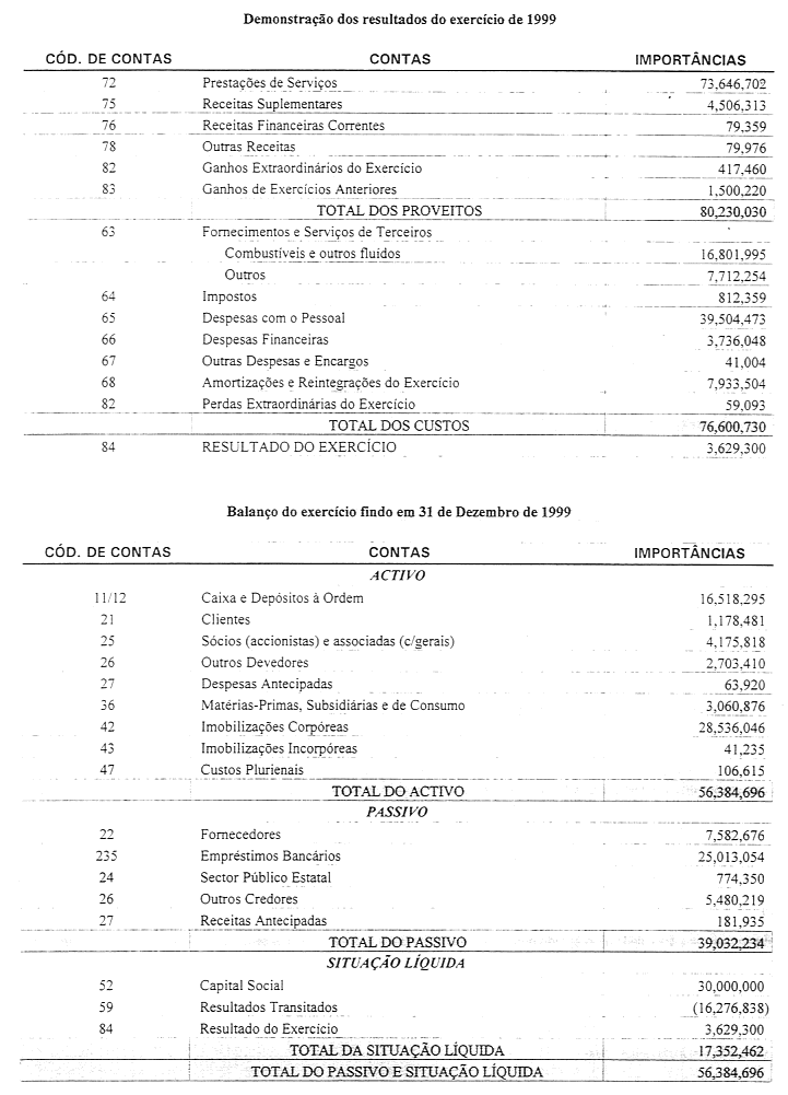 Demonstração de resultados do exercício de 1999