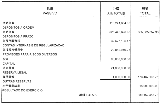 一九九九年年底的存款總額為陸億叁千陸佰萬澳門元,與前一年比較上升了二十三個百分點。