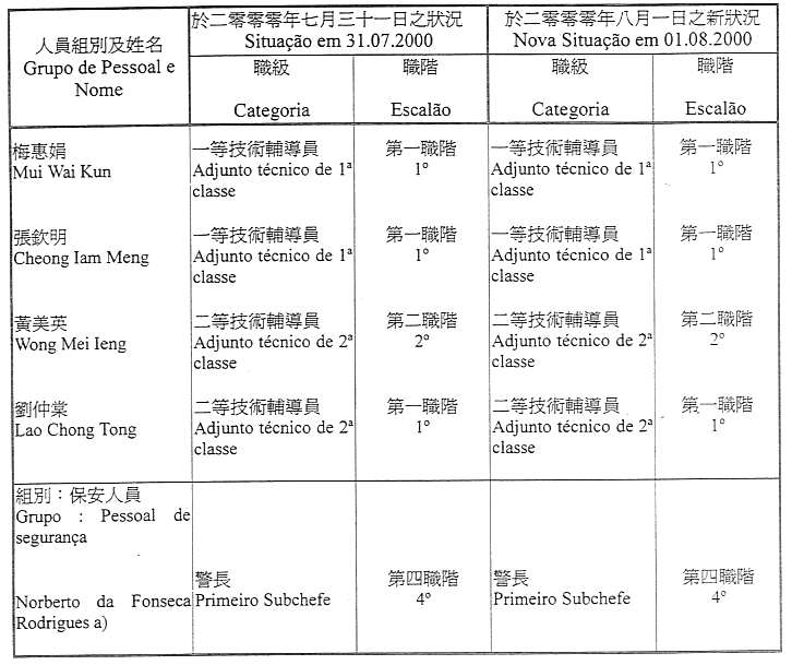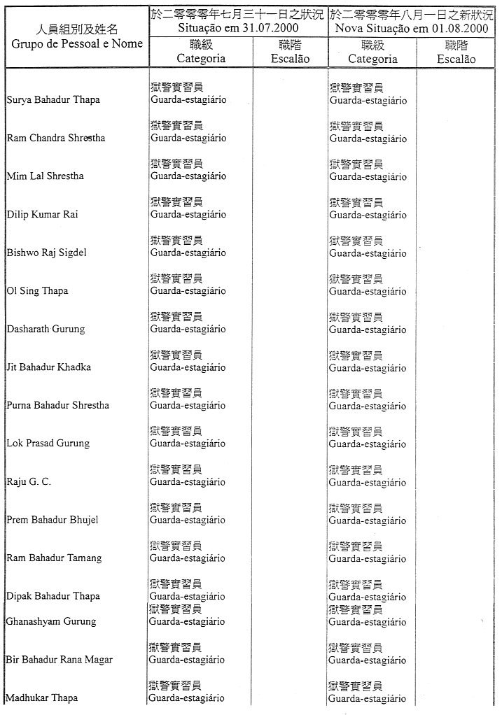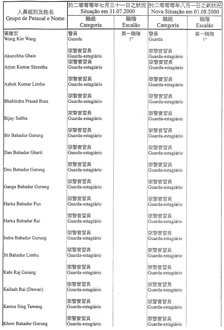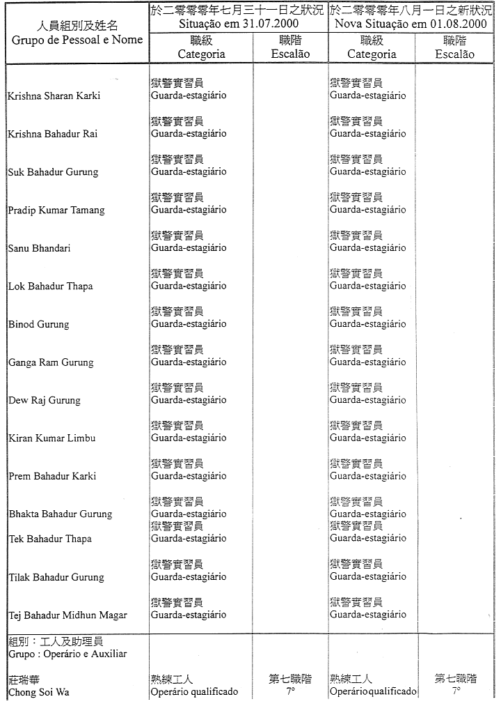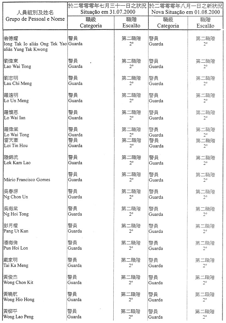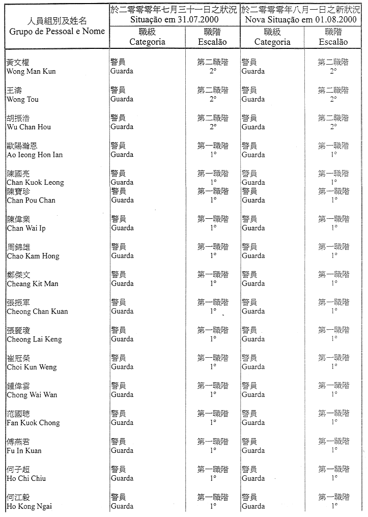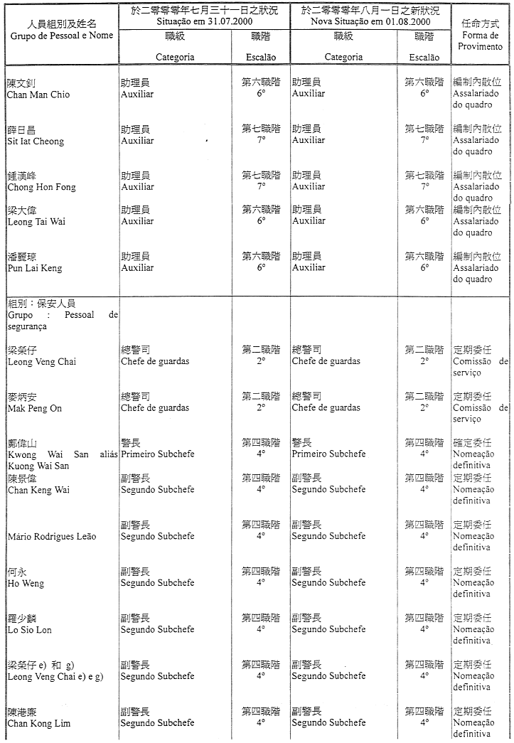 Lista nominativa do pessoal pertencente ao quadro, ou contratado, da Direcção dos Serviços de Justiça que transita, a partir de 1 de Agosto de 2000, para o quadro do Estabelecimento Prisional de Macau, nos termos do artigo 14.º do Regulamento Administrativo n.º 25/2000, publicado no Boletim Oficial da RAEM n.º 27, I Série, de 3 de Julho: