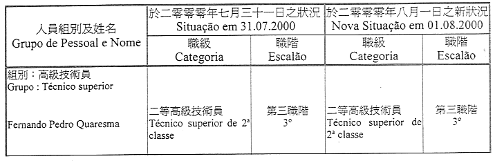 Que, nos termos do disposto no artigo 14.º do Regulamento Administrativo n.º 25/2000, o pessoal do quadro da Direcção dos Serviços de Justiça e bem assim o pessoal a ela vinculado por qualquer outra forma de provimento constante das listas nominativas anexas ao presente despacho, e que do mesmo fazem parte integrante, transitam, sem alteração da forma de provimento e no mesmo cargo, carreira, categoria e escalão, para o Estabelecimento Prisional de Macau criado pelo Regulamento Administrativo acima citado, com efeitos a partir de 1 de Agosto de 2000.