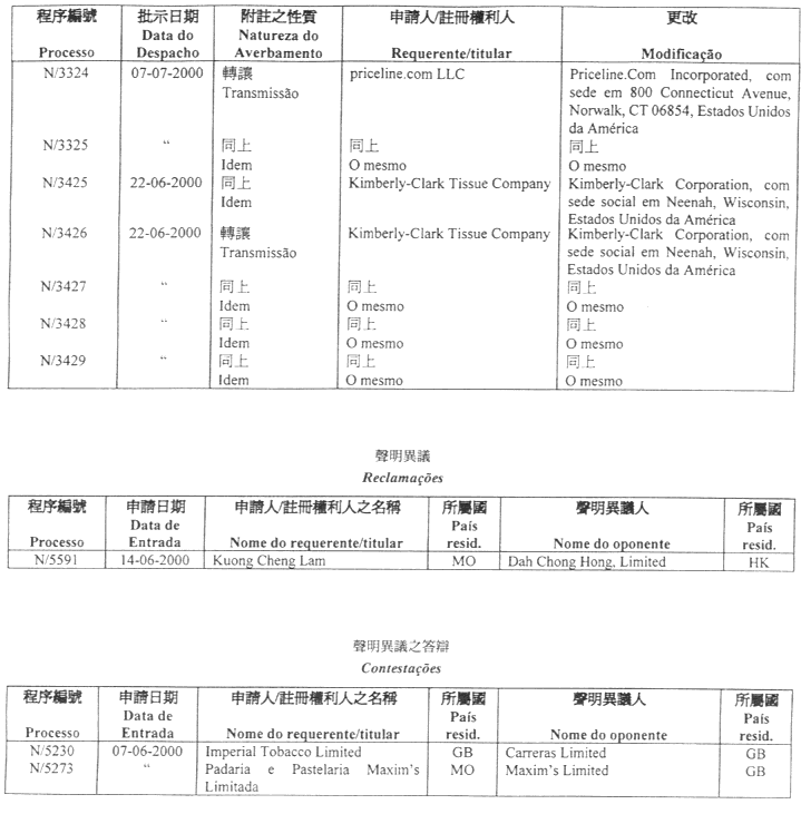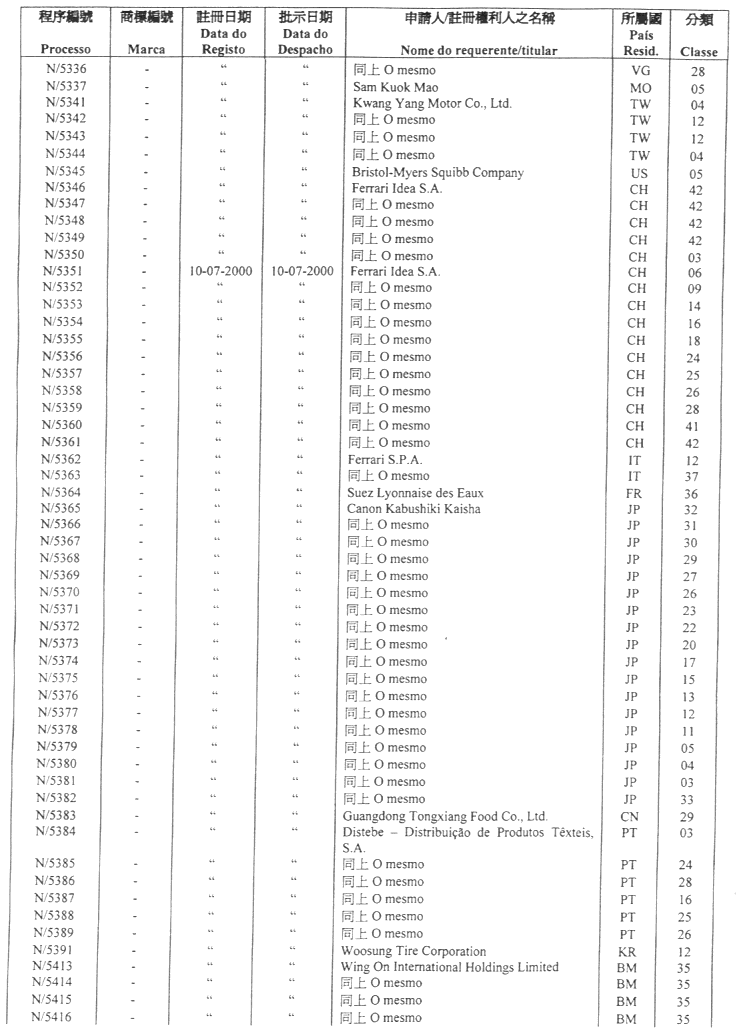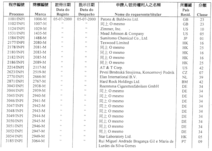 商標編號 N/1693 — 在服務名單應改為:“廣告服務;商貿經營服務;貿易管理服務;辦公室工作服務、包括提供與廣告、商品出售、按貿易類別分類的商店及銷售量評估有關的資訊;貿易資訊服務;提供商業資訊服務;為他人的廣作服務;電子購物服務、包括透過全球電腦網絡展示各樣商店和商品及接受使用者的訂貨服務;以廣告為目的之展覽管理服務;以廣告為目的之展覽場地租賃服務;電話接待服務;應接電話的秘書職務化理服務;透過電腦數據庫作市場研究服務;貿易經營及諮詢服務;計劃促銷及廣告推廣服務”。