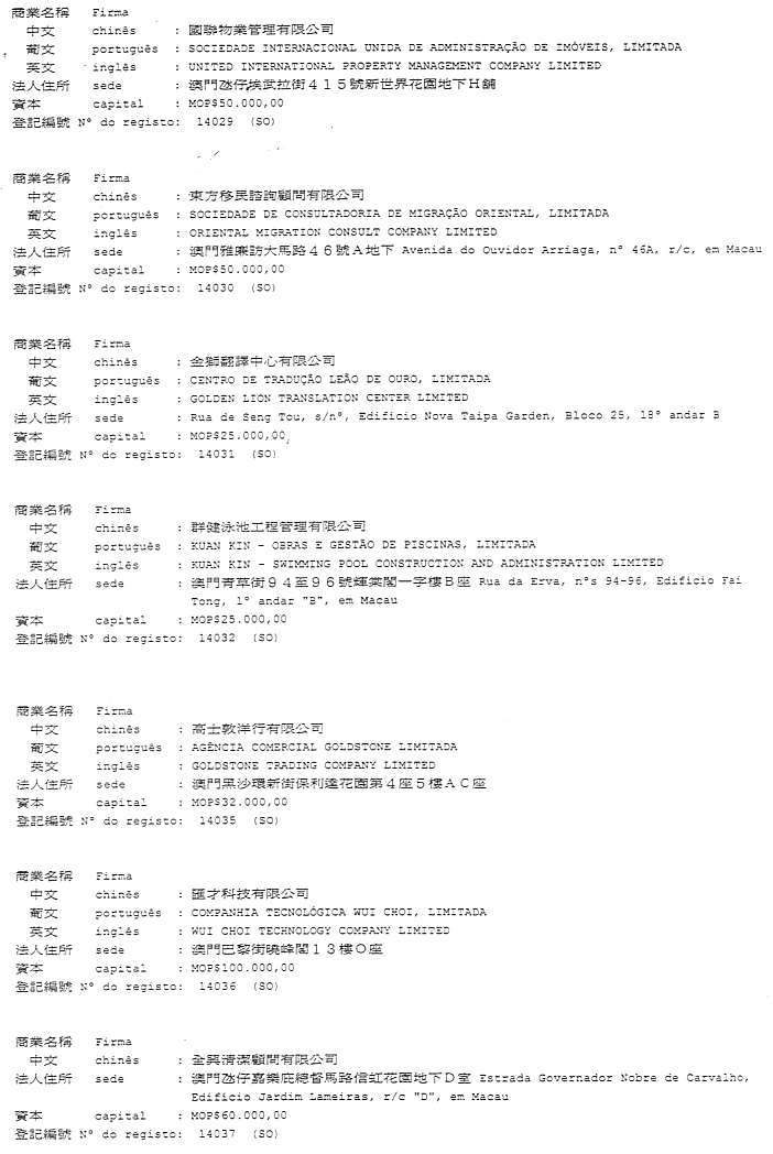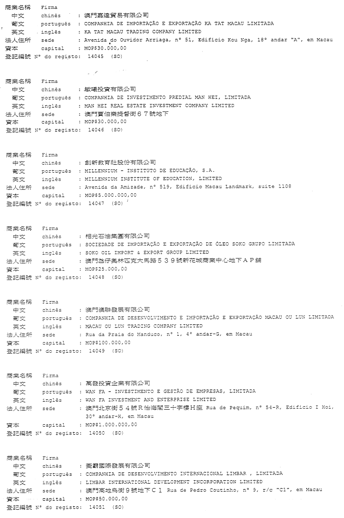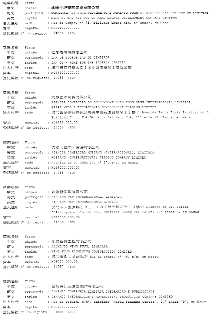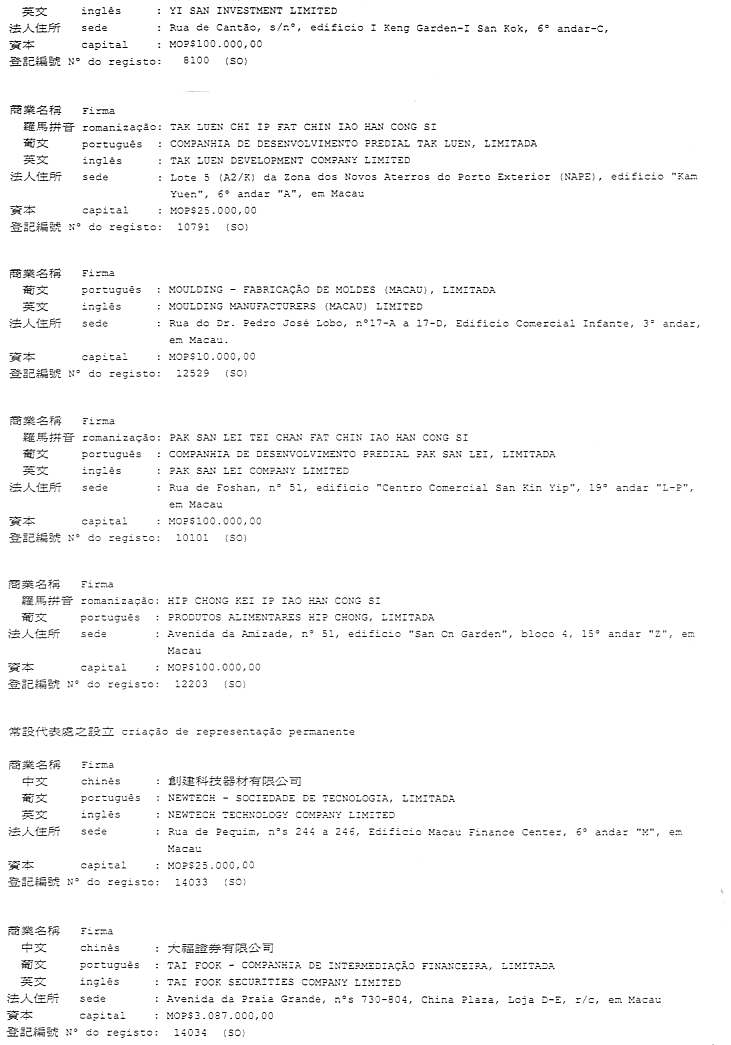 二零零零年十月五日於商業及汽車登記局——局長 盧瑞祥