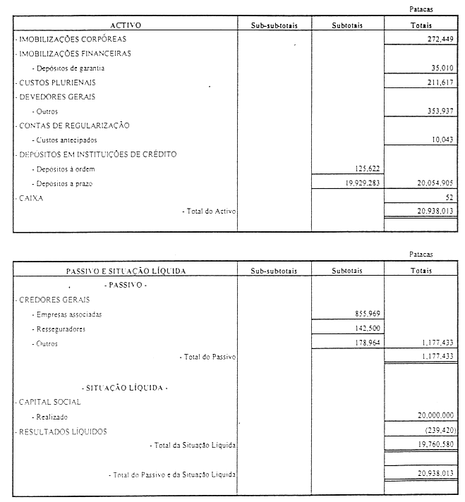 Na nossa opinião, o balanço e a conta de ganhos e perdas dão uma imagem verdadeira e apropriada da situação financeira da Sociedade em 31 de Dezembro de 1999 e foram devidamente elaborados de conformidade com as disposições das leis de Macau e certificados por Auditor de Contas.