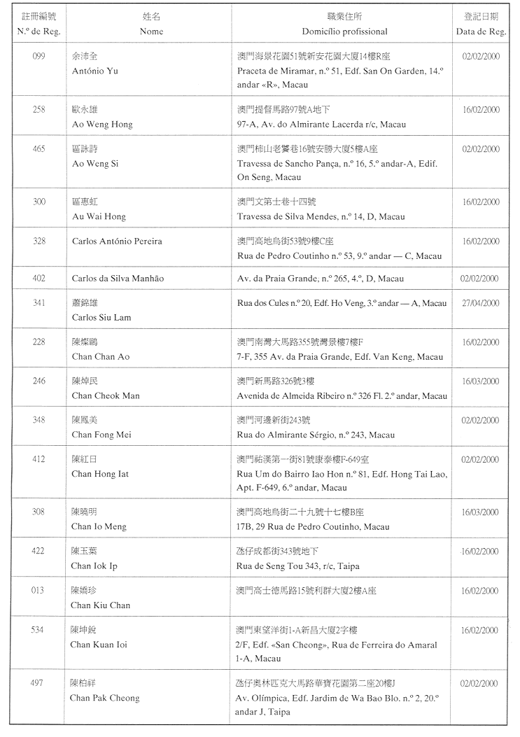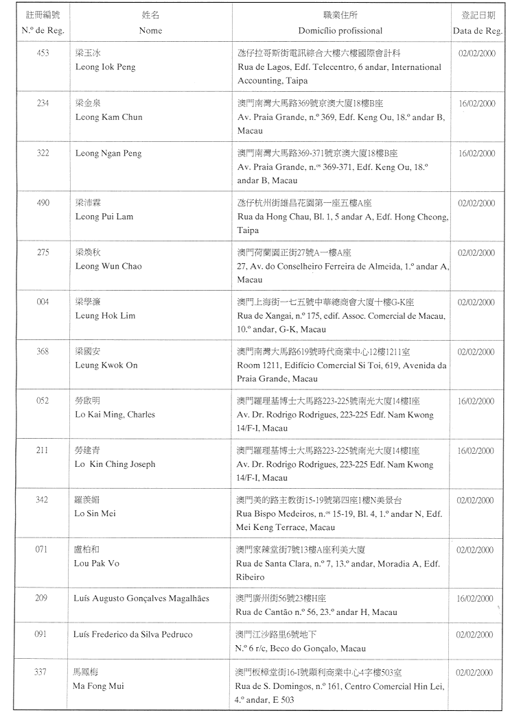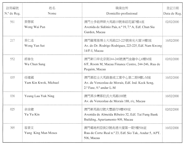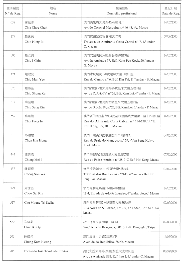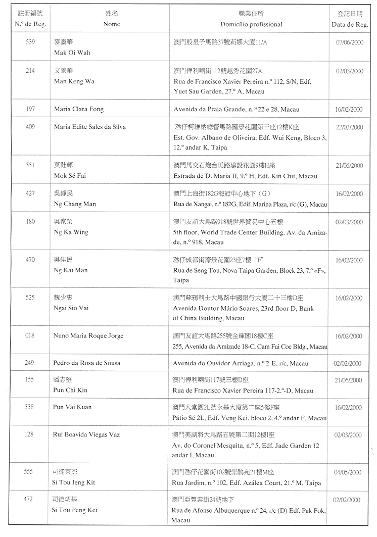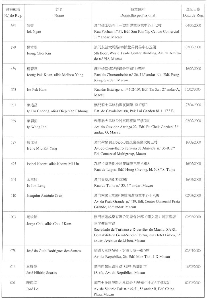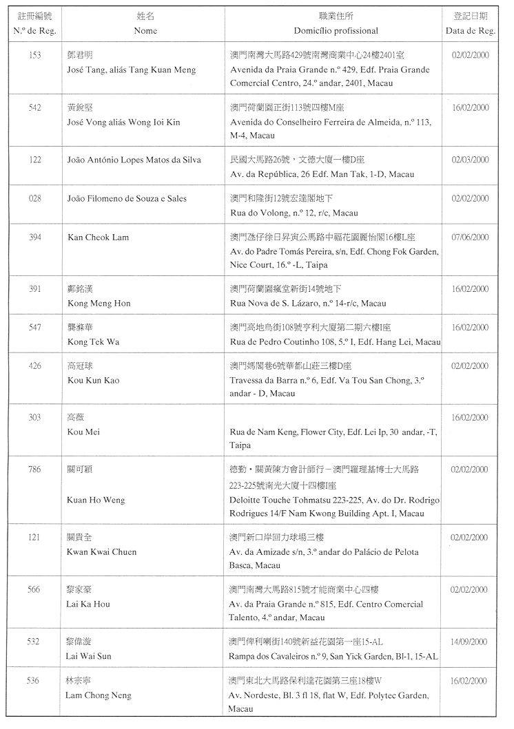 根據十一月一日第72/99/M號法令規定,至二零零零年十二月三十一日止於核數師暨會計師註冊委員會的註冊會計師名單: