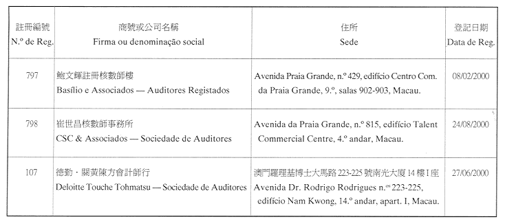 根據十一月一日第71/99/M號法令規定,至二零零零年十二月三十一日止於核數師暨會計師註冊委員會的註冊核數公司名單: