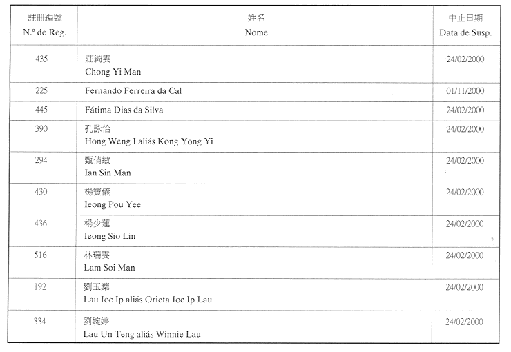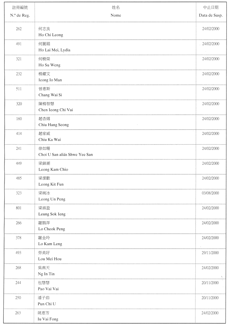 根據十一月一日第72/99/M號法令規定,至二零零零年十二月三十一日止於核數師暨會計師註冊委員會中止註冊的會計師名單: