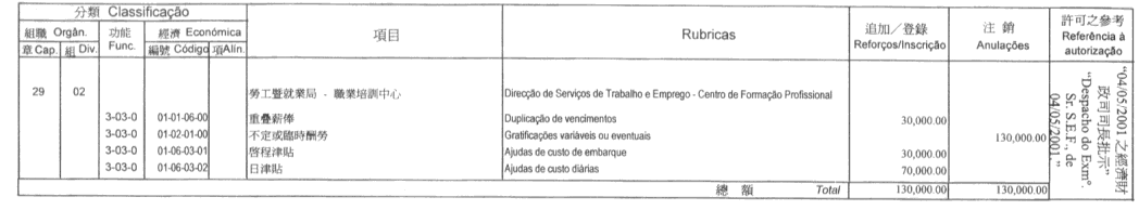 根據九月二十七日第53/93/M號法令第十九條規定,公佈經行政法務司司長於二零零一年五月二十二日批准的二零零一年財政年度印務局本身預算的第一次修改: