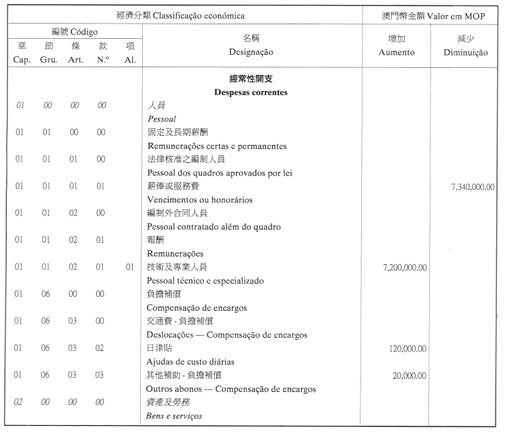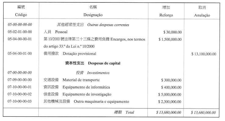 根據第31/2000號行政法規第二十三條及九月二十七日第53/93/M號法令第十九條之規定,茲將代廉政專員行使第10/2000號法律第二十五條一款所賦予的權力,於二零零一年八月十五日以批示核准之二零零一年廉政公署本身預算第03/CCAC/2001號預算修改刊登如下: