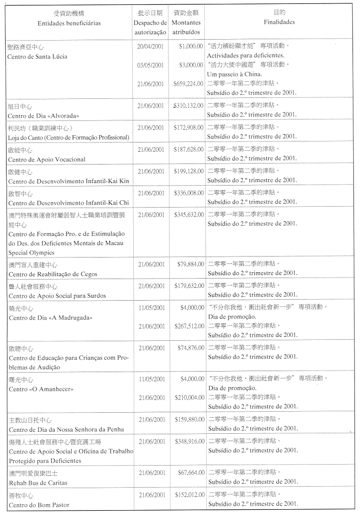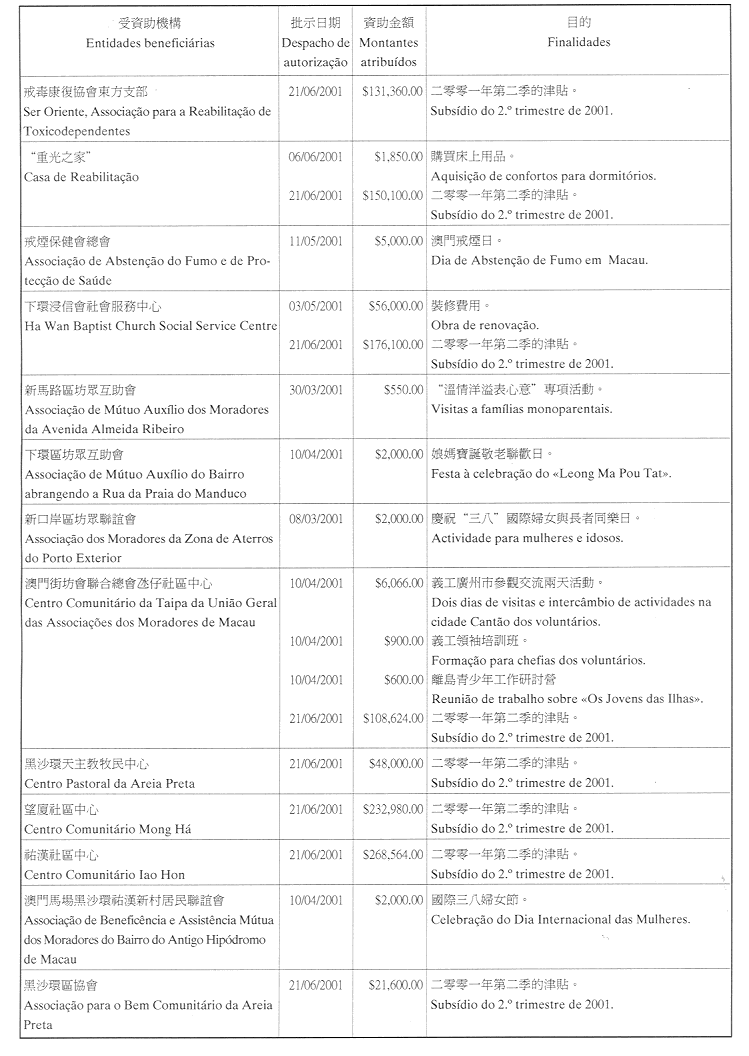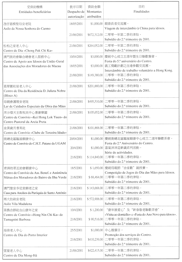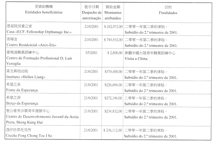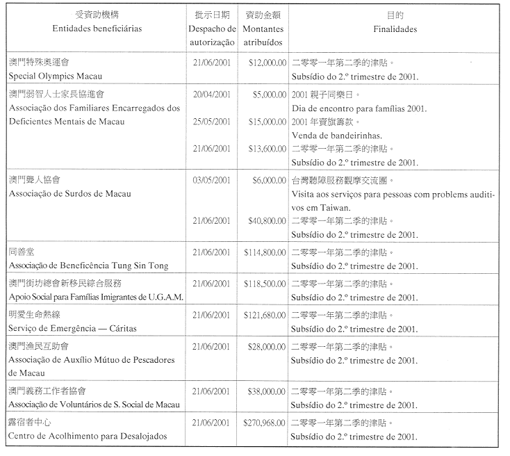 為履行有關給予個人及私人機構的財政資助的八月二十六日第54/GM/97號批示,社會工作局現公佈二零零一年第二季財政資助表: