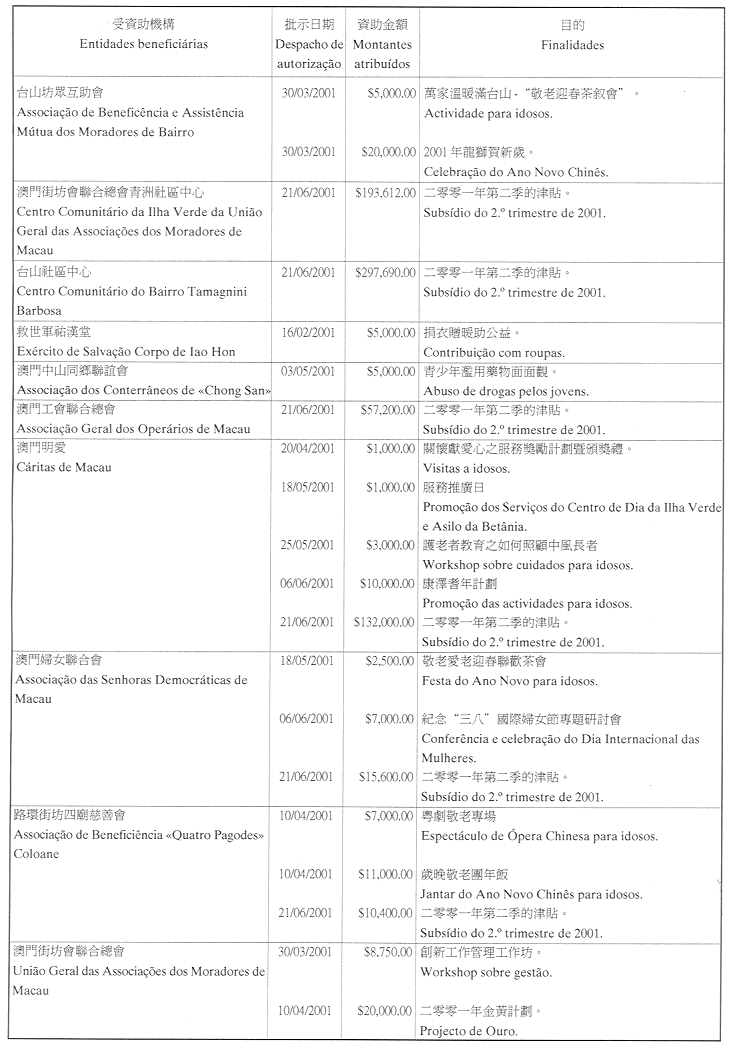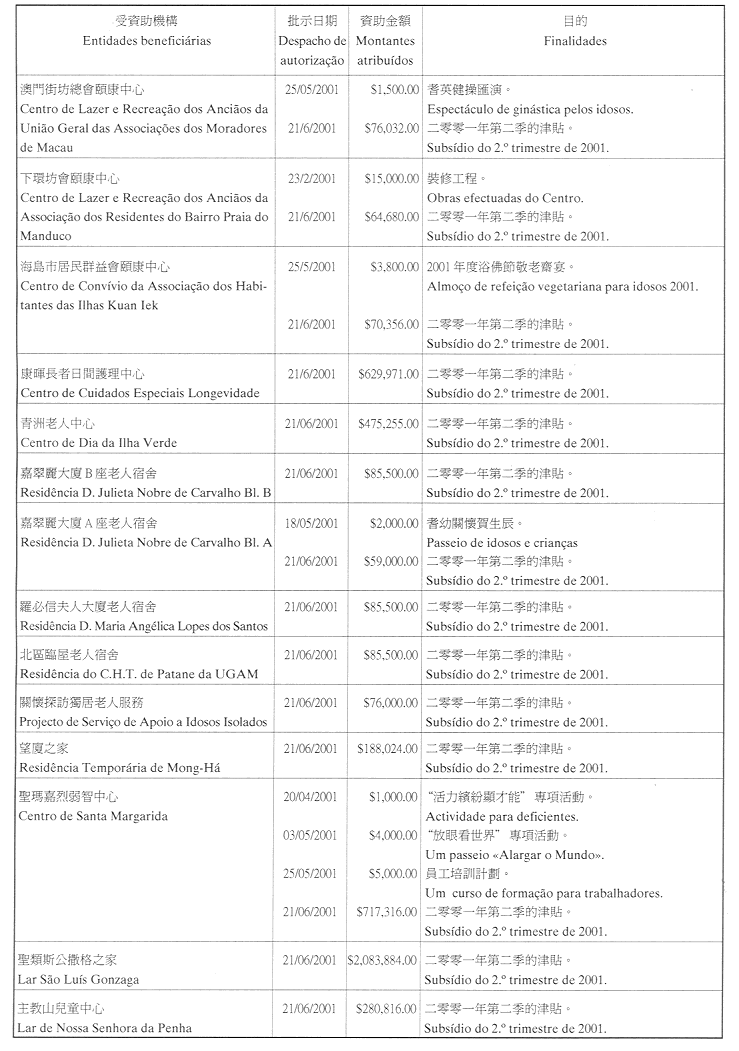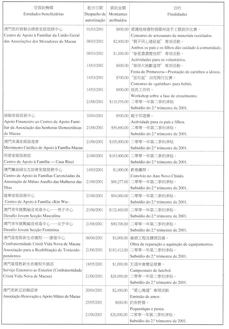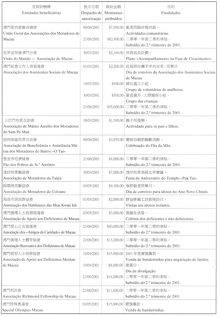 為履行有關給予個人及私人機構的財政資助的八月二十六日第54/GM/97號批示,社會工作局現公佈二零零一年第二季財政資助表: