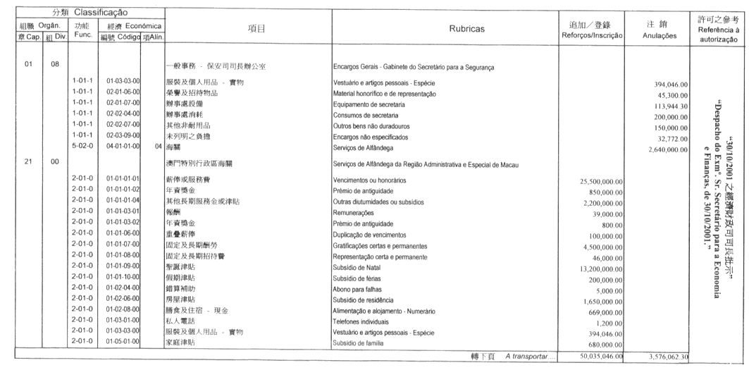 根據九月二十七日第53/93/M號法令第十九條之規定,公布二零零一年財政年度文化基金第四次預算修改,有關修改是經社會文化司司長二零零一年九月二十二日的批示許可: