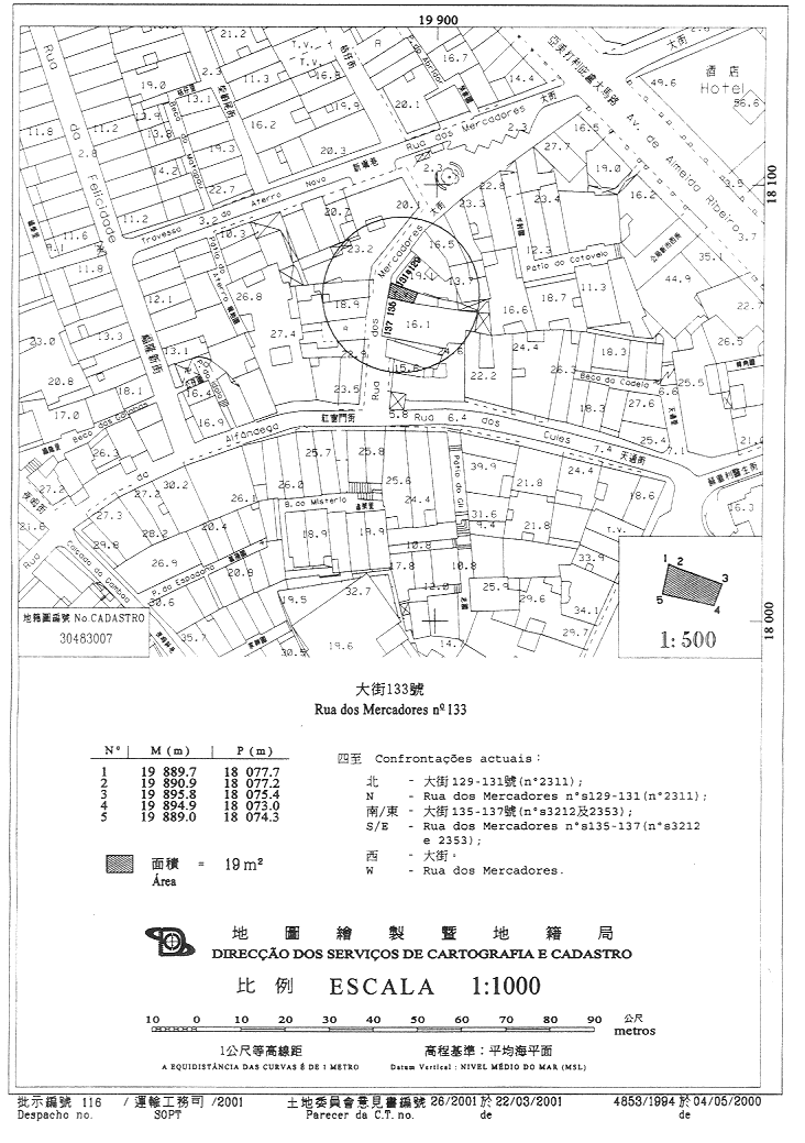 本合同標的為完善一幅以長期租借制度批出,位於澳門半島大街,昔日其上建有133號樓宇,面積19(拾玖)平方米的土地的批給。該土地標示在地圖繪製暨地籍局於二零零零年五月四日發出的第4853/1994號地籍圖及物業登記局第1203號,並以乙方名義登錄於該局第19366號,其利用權已由前澳門普通管轄法院第三分庭作出及載於第133/94號普通訴訟程序筆錄的判決確認,並於一九九六年五月八日經前澳門高等法院作出的合議庭裁決確定屬乙方所有。
