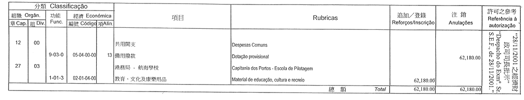 根據九月二十七日第53/93/M號法令第十九條的規定,公佈經由社會文化司司長於二零零一年十二月四日批示所核准的澳門大學二零零一年財政年度本身預算之第四次修改: