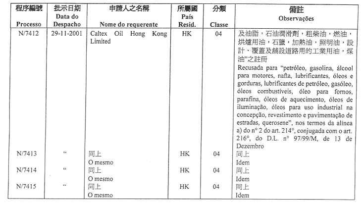 產品:工業用油及油脂;潤滑劑;吸收、噴灑和黏結灰塵化合品;燃料(包括馬達用汽油)及照明材料;蠟燭,燈芯。