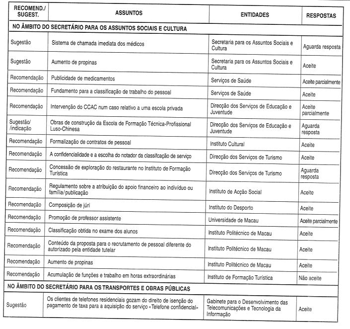 O ano 2000 foi o primeiro ano completo em que exerci as funções de Comissário contra a Corrupção da Região Administrativa Especial de Macau e aproveito esta ocasião para agradecer ao Governo Popular Central e a Sua Excelência, o Chefe do Executivo, por me terem dado esta oportunidade de contribuir com o meu esforço modesto para Macau, numa área tão importante e difícil.