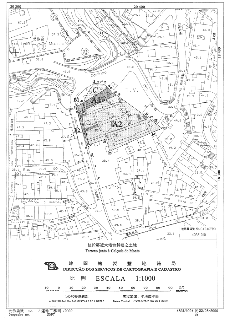 四、然而,根據地圖繪製暨地籍局於二零零零年八月二十二日發出、屬本批示附件及組成部份的第4831/1994號地籍圖所載,上指地段經湊整後的面積為93平方米,並由兩幅零碎地段組成。一幅面積27平方米,以字母“B1”標示,為標示於B-27冊第62頁第10054號的澳門特別行政區長期租借地的組成部份,其利用權以美國Virgínia, Richmond的“The Foreign Mission Board of the American Southern Baptist Convention”名義登錄於F-3冊第112頁第1860號。另一幅面積為66平方米,以字母“B2”標示,為登記於B-22冊第225頁第5305號的地段的組成部份、以完全所有權制度及該實體名義登錄於G-6冊第116頁背頁第6320號。