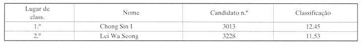 Do concurso comum, de ingresso, de prestação de provas, para o preenchimento de duas vagas de assistente de relações públicas de 2.ª classe, 1.º escalão, do grupo de pessoal técnico-profissional do quadro de pessoal civil da Direcção dos Serviços das Forças de Segurança de Macau, aberto por aviso publicado no Boletim Oficial da Região Administrativa Especial de Macau n.º 7, II Série, de 15 de Fevereiro de 2002.