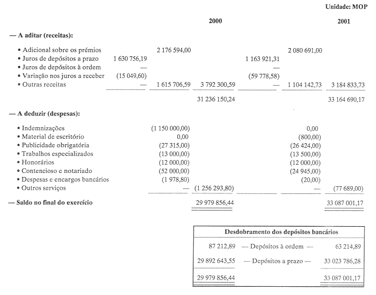 • Quanto ao passivo, constituído apenas pelas provisões para sinistros, registou-se um aumento de 25 mil patacas (mais 100% comparativamente a 2000), como resultado das responsabilidades inerentes em relação aos processos judiciais;