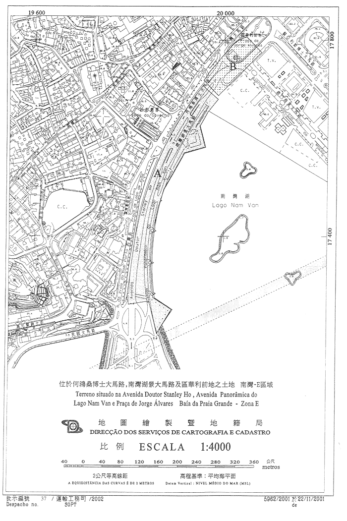 1. O edifício designado por Bloco I, em regime de propriedade horizontal, destinado a comércio e estacionamento (Auto-Silo da Sede do Governo) e o edifício designado por Bloco II destinado a estacionamento público (Auto-Silo da Nam Van), situados na península de Macau, na Avenida Doutor Stanley Ho, Avenida Panorâmica do Lago Nam Van e Praça de Jorge Álvares, na zona E do plano de urbanização da zona da Baía da Praia Grande, ambos propriedade da Região Administrativa Especial de Macau, foram construídos no subsolo do terreno vago constituído pelas parcelas assinaladas com as letras "A" e "B" na planta n.º 5 962/2001, emitida pela Direcção dos Serviços de Cartografia e Cadastro (DSCC), em 22 de Novembro de 2001, respectivamente com as áreas de 21 546 m2 e 6 332 m2.