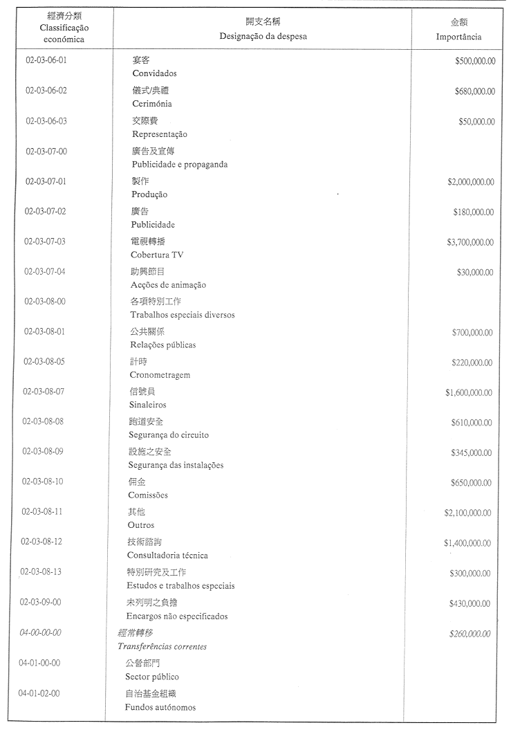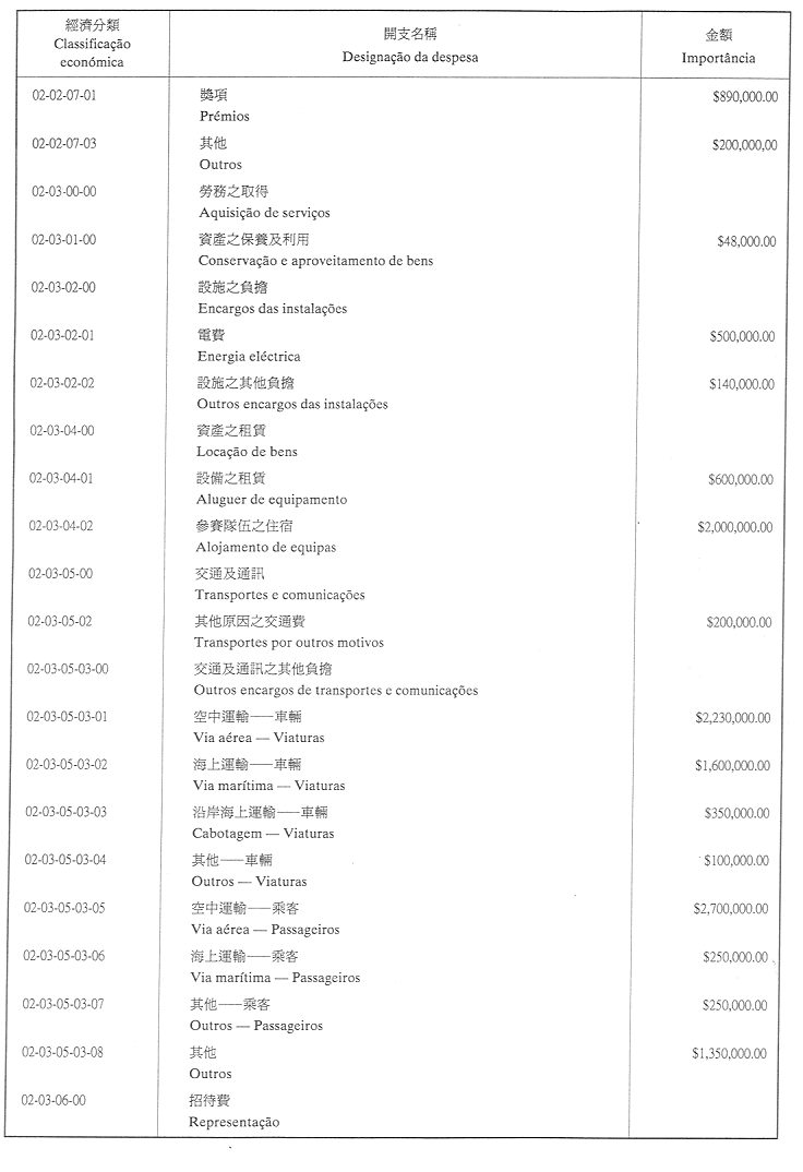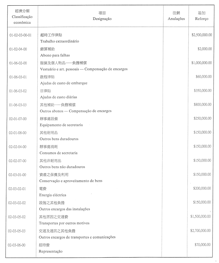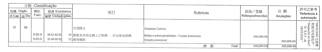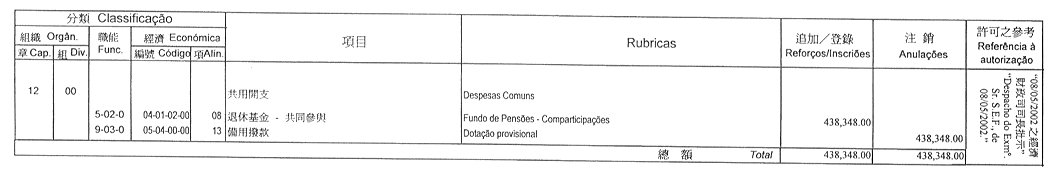 根據四月三十日第17/GM/87號批示,茲公布下列(澳門特別行政區財政預算/二零零二)款項轉帳,該轉帳由經四月二十七日第22/87/M號法令第一條修訂的十一月二十一日第41/83/M號法令第二十一條第三項規定所核准: