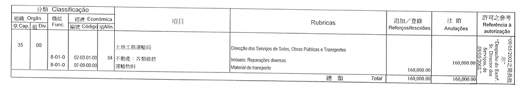 根據九月二十七日第53/93/M號法令第十九條的規定,公佈經運輸工務司司長於二零零二年五月十日批示核准的有關二零零二年度政府船塢本身預算的第一次修改: