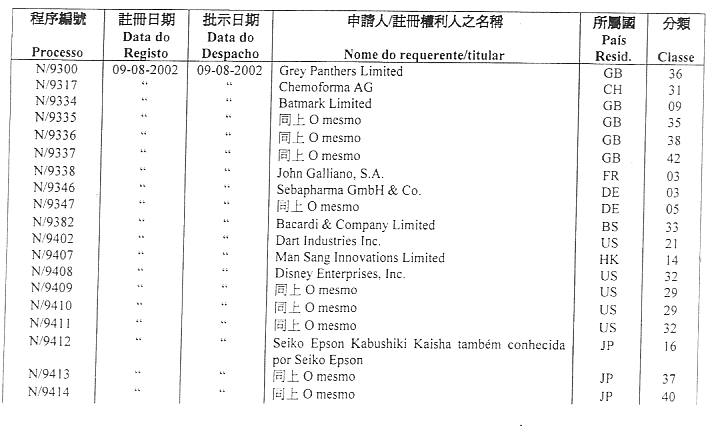 根據十二月十三日第97/99/M號法令第十條及第二百一十條,以下公布本地區商標註冊之請求書,並按照相同法規第二百一十一條第一款,由通告公布日期開始計算兩個月期限內提出聲明異議。