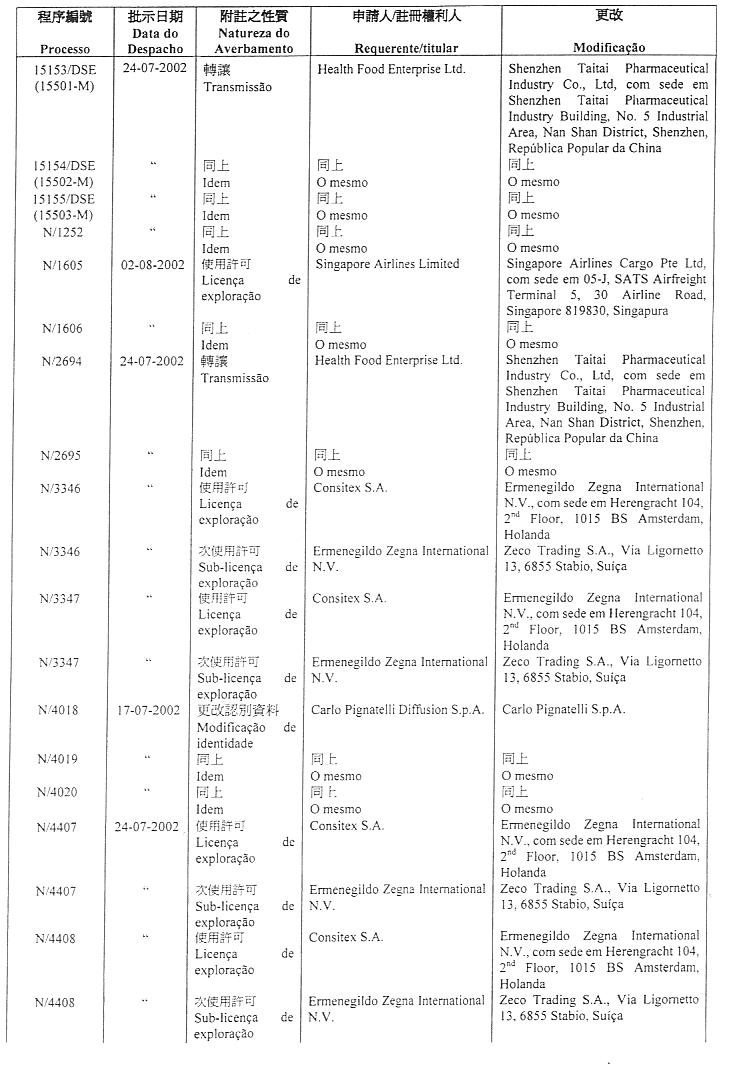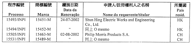 商標編號N/7577 — 在葡文版產品名單內,原文為:"toalhas de mesa de papel"應改為:"guardanapos de papel"