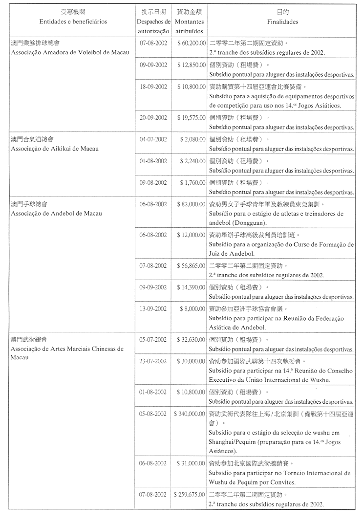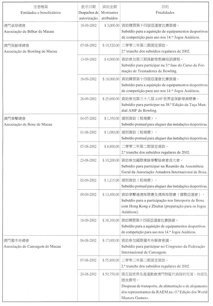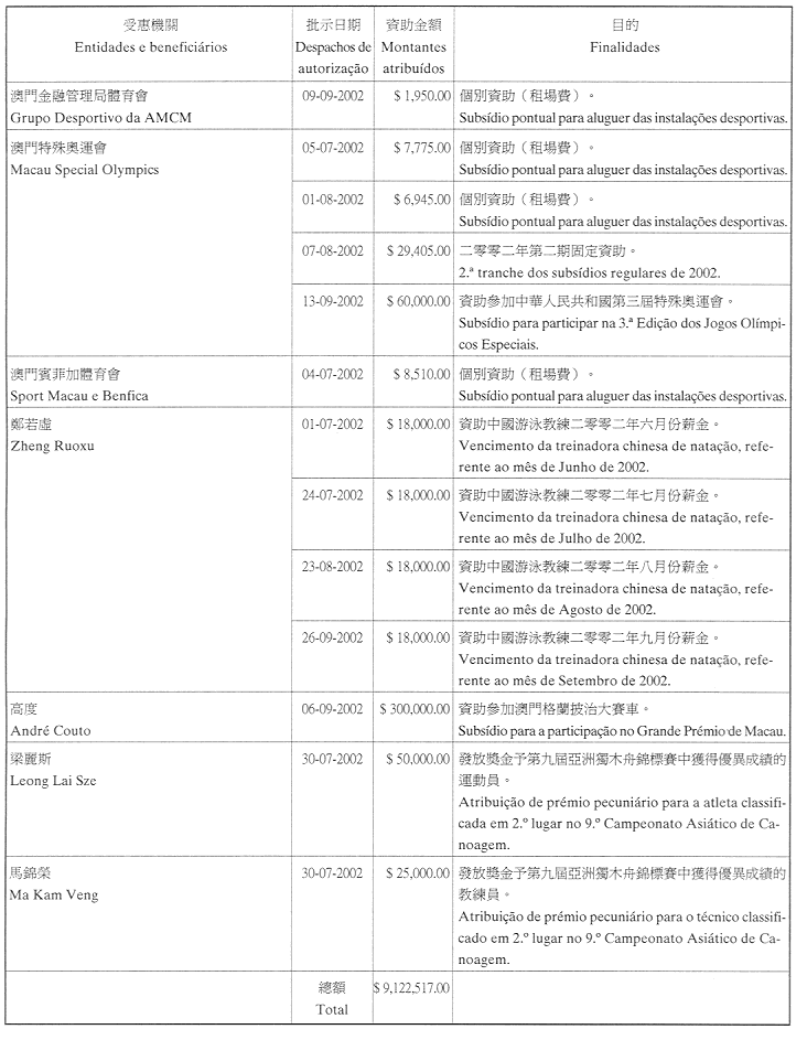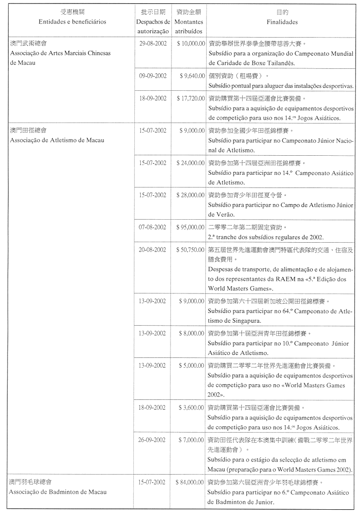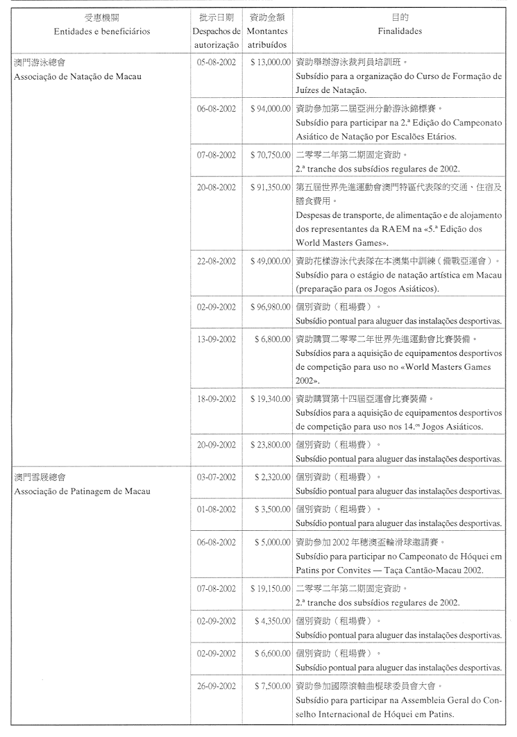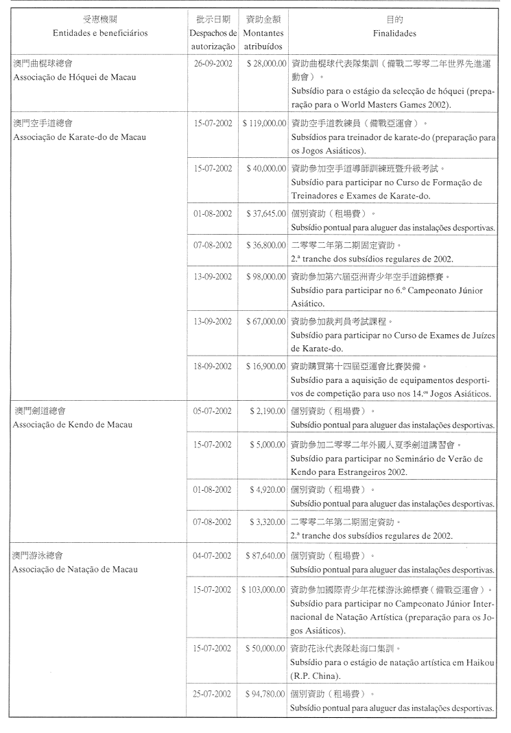 為履行關於給予私人及私人機構的財政資助的八月二十六日第54/GM/97號批示,體育發展基金現公佈二零零二年第三季度的資助表: