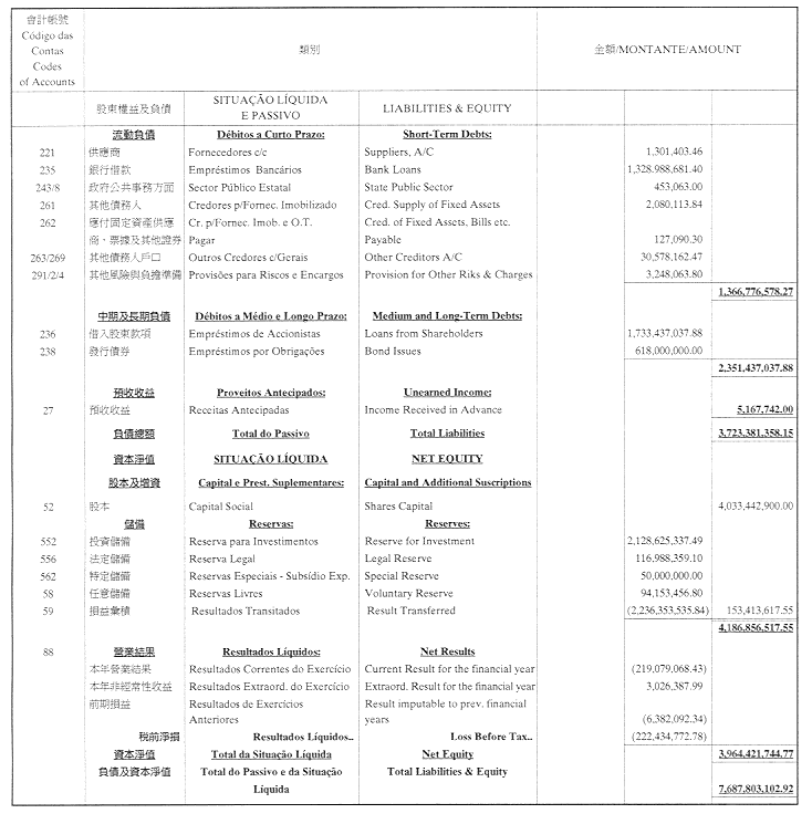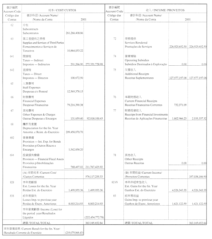 O exercício de 2001 registou um resultado líquido negativo de MO P222,434.773 (duzentos e vinte e dois milhões, quatrocentas e trinta e quatro mil e setecentas e setenta e três patacas).