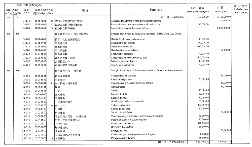 根據四月三十日第17/GM/87號批示,茲公布下列(澳門特別行政區財政預算/二零零二)款項轉帳,該轉帳由經四月二十七日第22/87/M號法令修訂的十一月二十一日第41/83/M號法令第二十一條及第二十二條規定所核准: