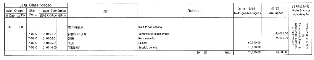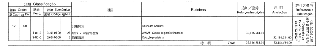 根據九月二十七日第53/93/M號法令第十九條規定, 茲公佈運輸工務司司長於二零零二年十二月六日批示所核准的民航局二零零二年財政年度之本身預算第二次修改:
