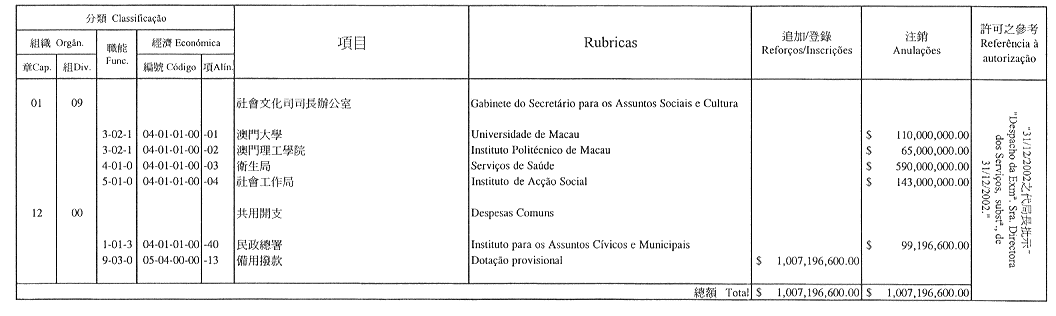 根據九月二十七日第53/93/M號法令第十九條之規定,茲公布社會文化司司長於二零零二年十二月三十一日批准之衛生局二零零二年度本身預算之第七次預算修改: