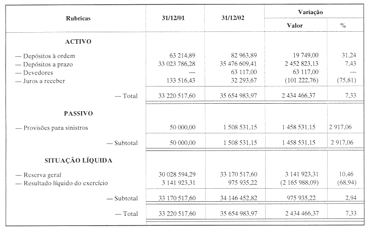 Mapa comparativo do balanço do Fundo de Garantia Automóvel e Marítimo em 31/12/01 e 31/12/02