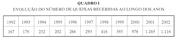 - Quadro I Evolução do Número de Queixas Recebidas ao Longo dos Anos