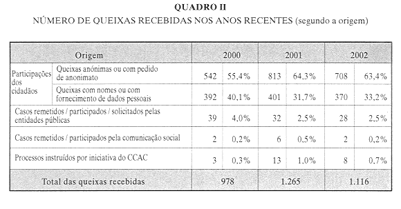 - Quadro II Número de Queixas Recebidas nos Anos Recentes (segundo a origem)